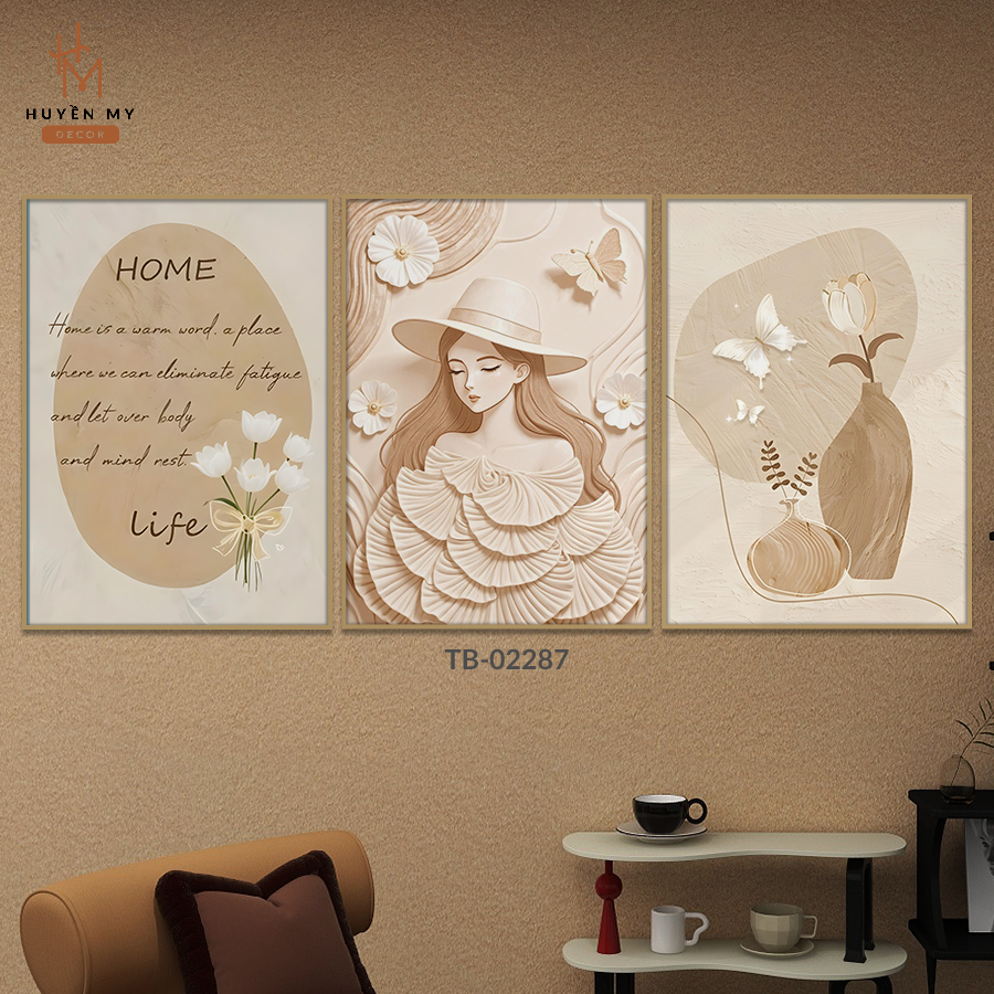Bộ 3 Tranh Dán Tường, Treo Tường Cô Gái, Hoa Lá Nghệ Thuật Phong Cách Bắc Âu - Trang Trí Phòng Khách, Phòng Ngủ