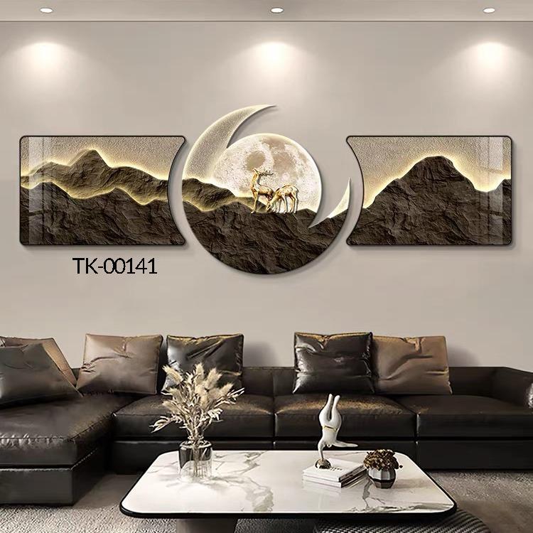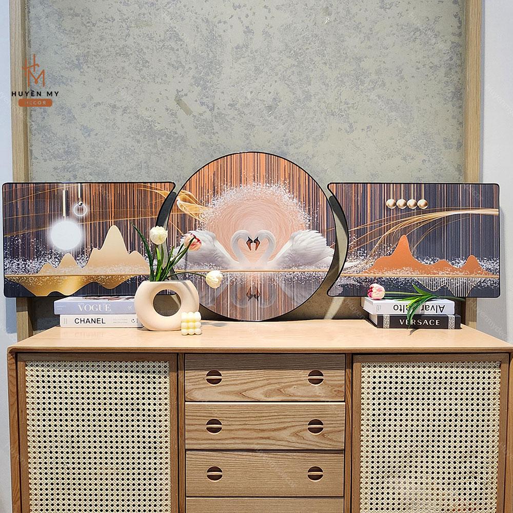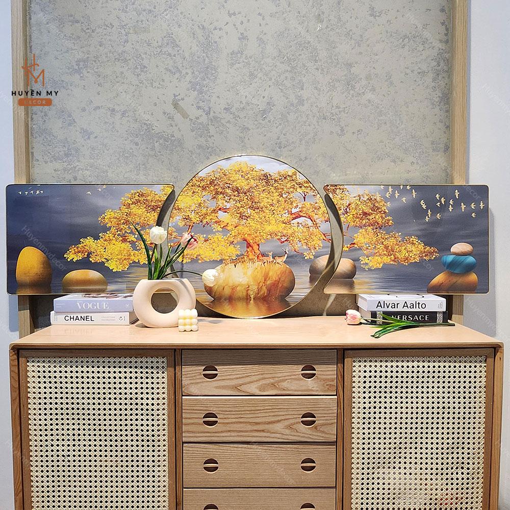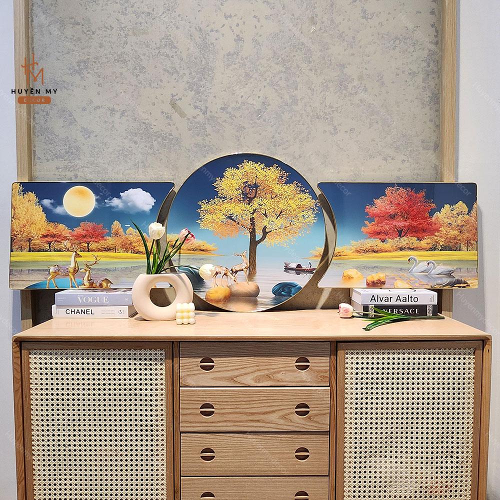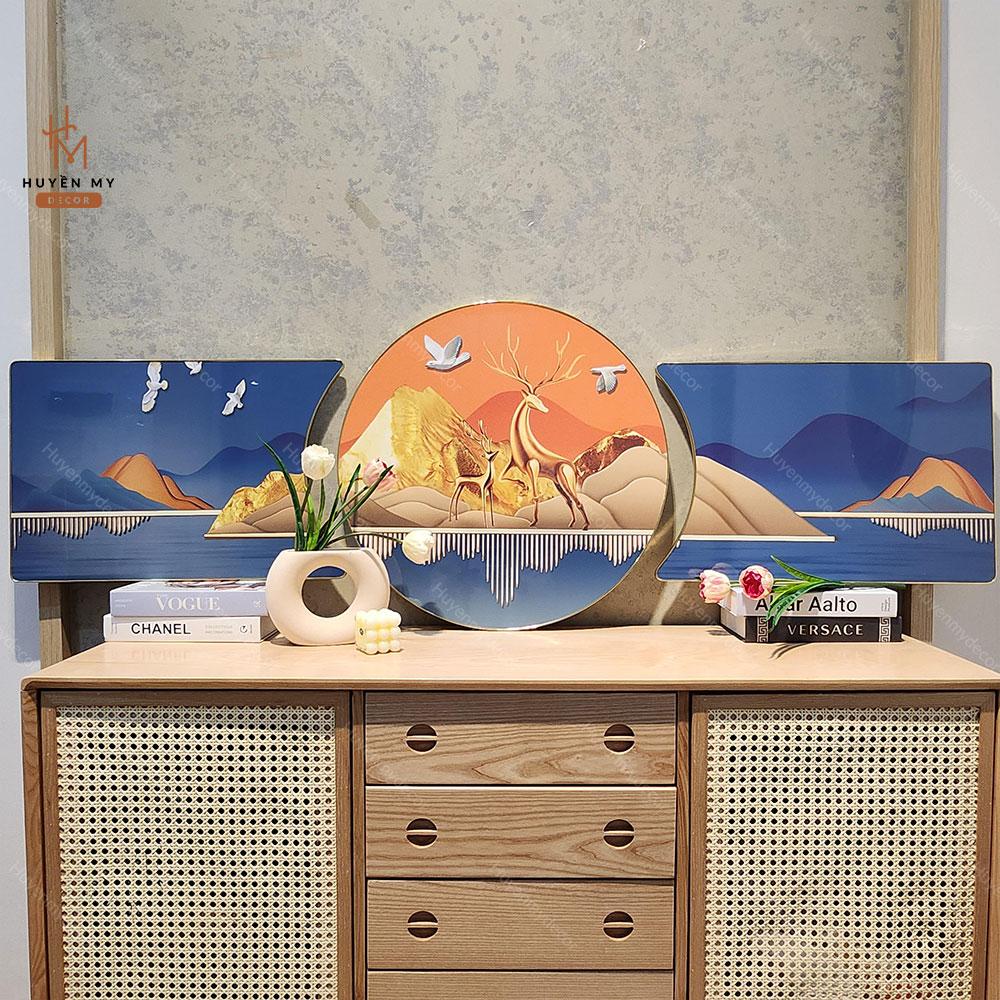 Bộ 3 Tranh Khuyết Tráng Gương Phong Thuỷ, Hươu Tuần Lộc, Trang Trí Phòng Khách, Phòng làm Việc, Huyền My Decor