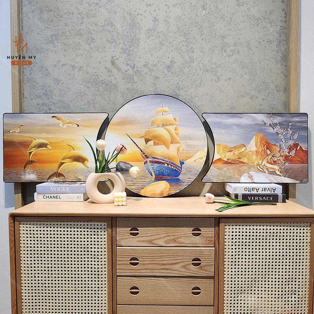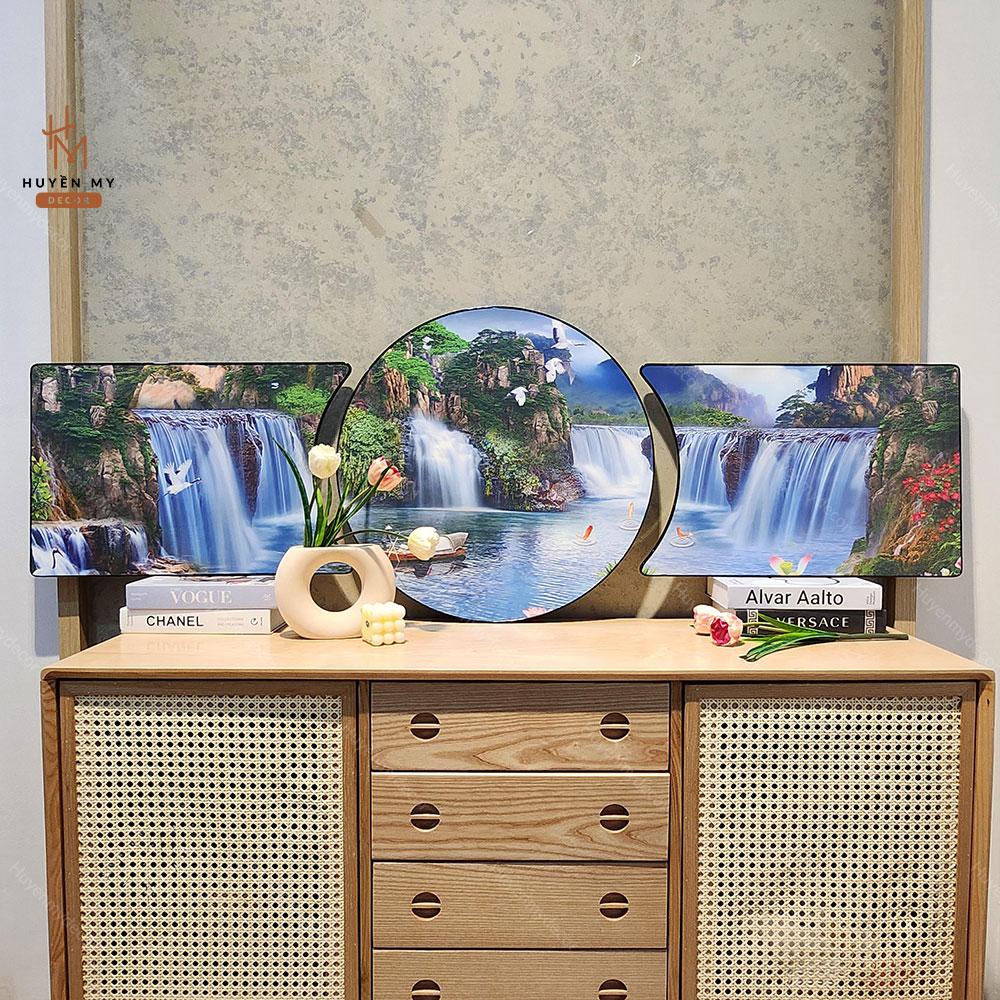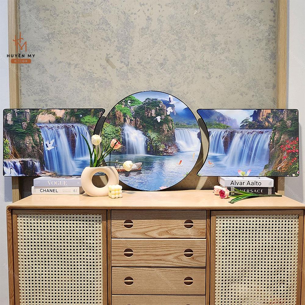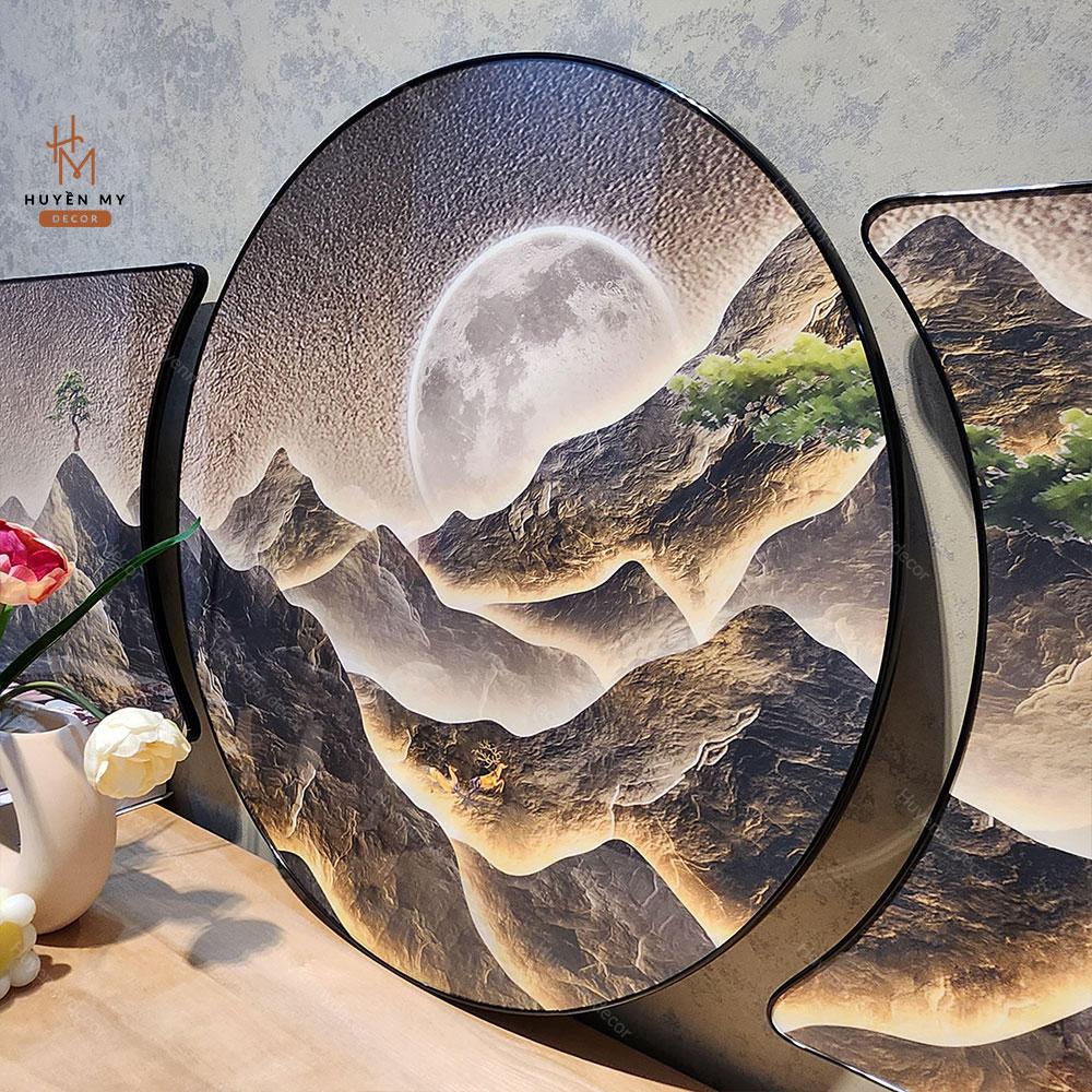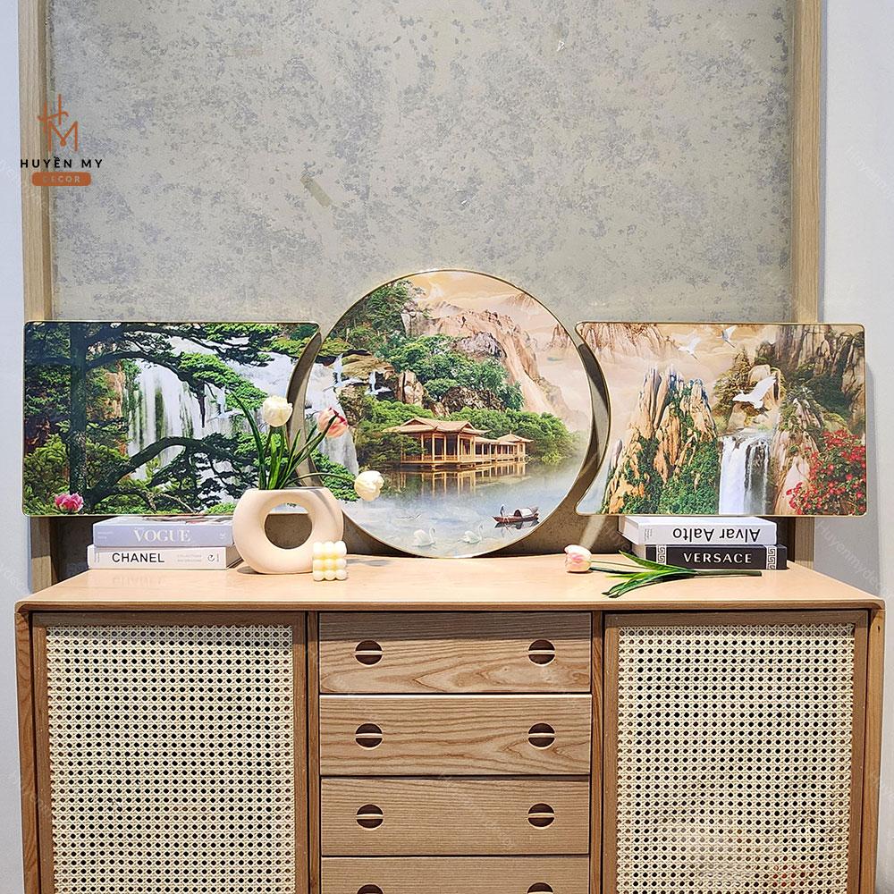 Bộ 3 Tranh Khuyết Tráng Gương Phong Thủy, Sơn Thủy Hữu Tình Hiện Đại, Trang Trí Phòng Khách, Phòng làm Việc, Huyền My Decor