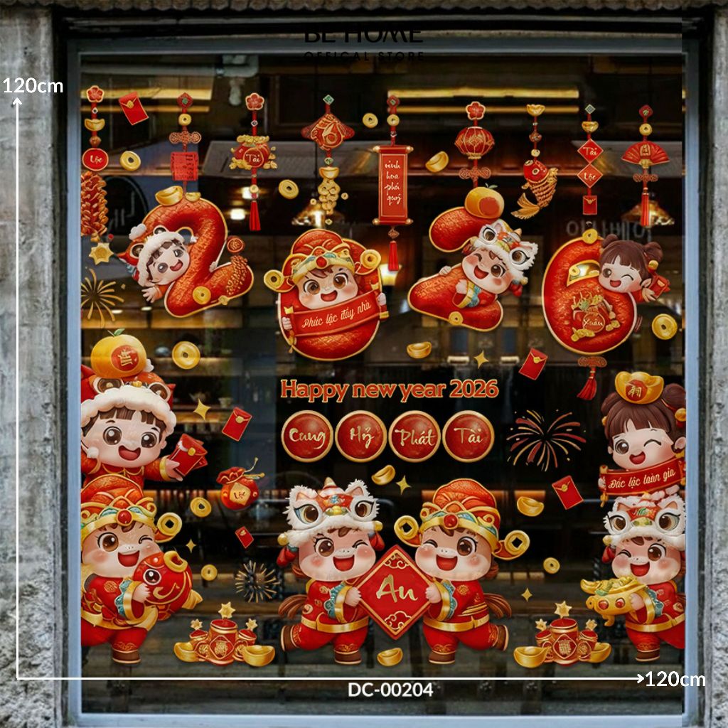 Tên sản phẩm: Decal Tết Bính Ngọ 2026 Dán Tường, Dán Cửa Kính, Gương, Quán Cafe, Studio, Chống Nước PVC – Huyền My Decor