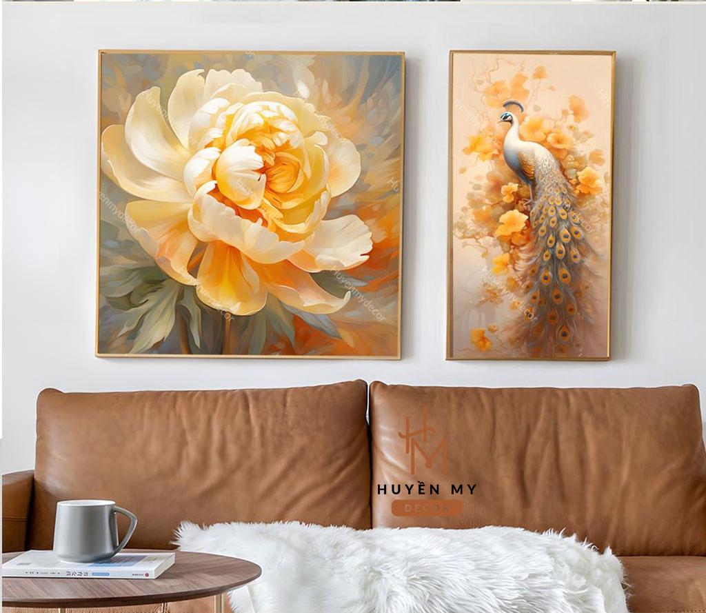Set 2 Tranh Hoa Phù Dung Và Chim Công Trang Trí Không Gian Ý Nghĩa Huyền My Decor Treo Tường Đồng