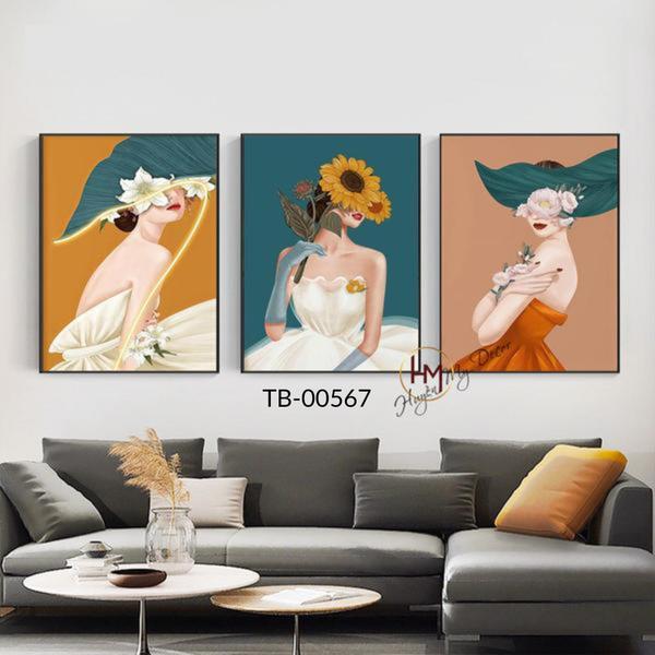 Set 3 tranh Cô Gái, canvas, lụa kim sa, decor siêu xinh, tặng kèm đinh 3 chân treo tranh, Phòng Khách, Treo Tường, Treo Phòng, Decor Tường