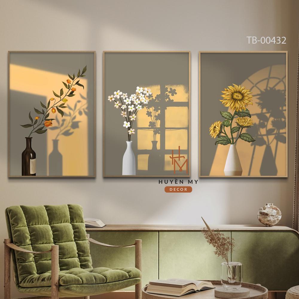 Set 3 Tranh Canvas, Lụa Kim Sa Treo Tường Họa Tiết Hoa Lá, Trang Trí Phòng Khách, Phòng Ngủ - Huyền My Decor