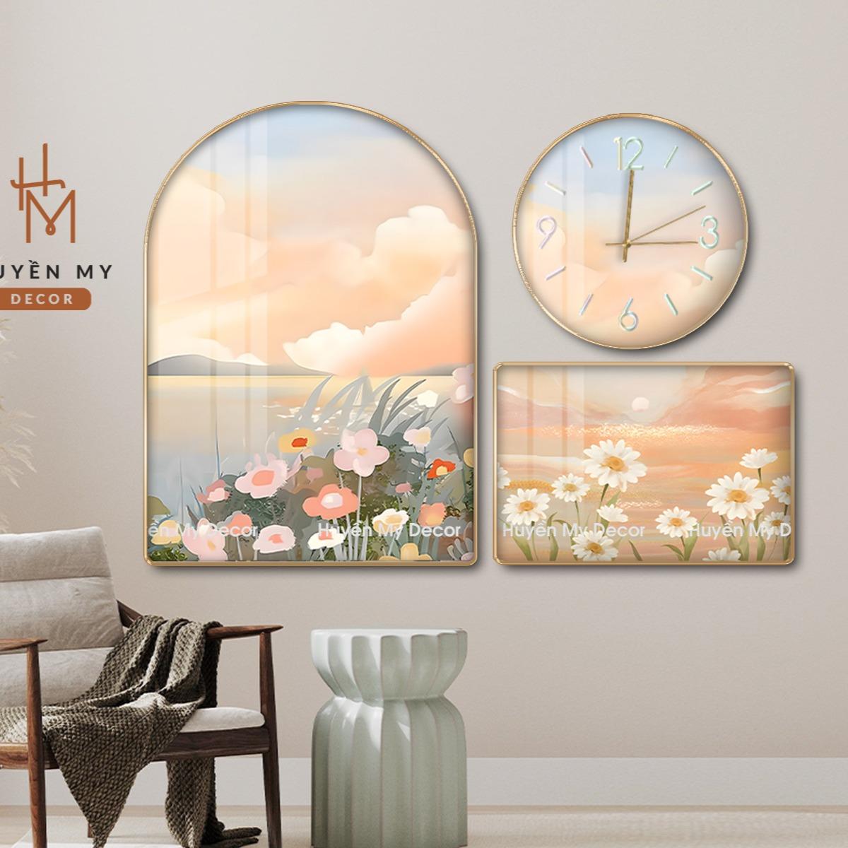 Set 3 Tranh Đồng Hồ Treo Tường Chất Liệu Lụa Kim Sa Huyền My Decor, Tranh Tráng Gương Decor Trang Trí Phòng Khách, Spa Trang Trí Nhà