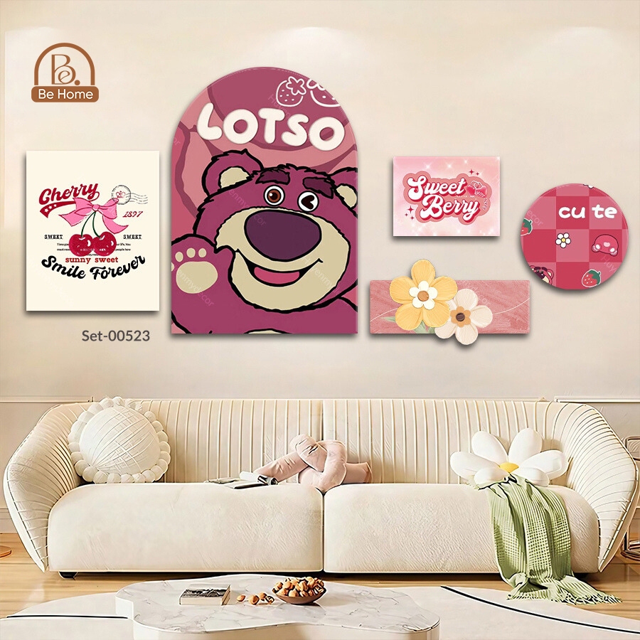 Set 5 Tranh Dán Tường Gấu Dâu Trẻ Em Ngộ Nghĩnh Trang Trí Phòng Ngủ, Phòng Khách,Homestay - Behome Decor