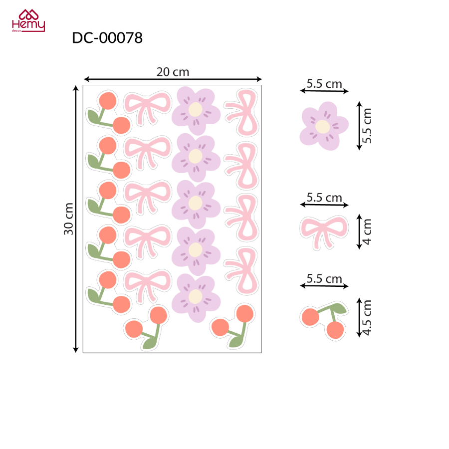 - Tên sản phẩm: Sticker Decal Dán Tường Cherry, Hoa Nơ Tím, Trang Trí Cửa Kính, Gương, Tường, Decor Quán Cafe, Spa - Hemy Decor